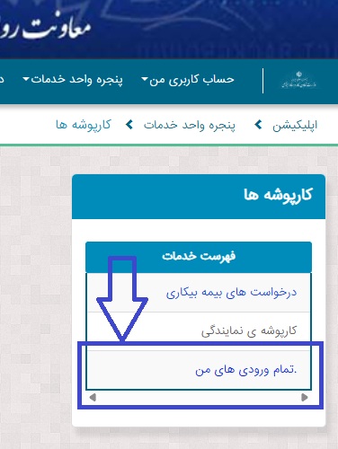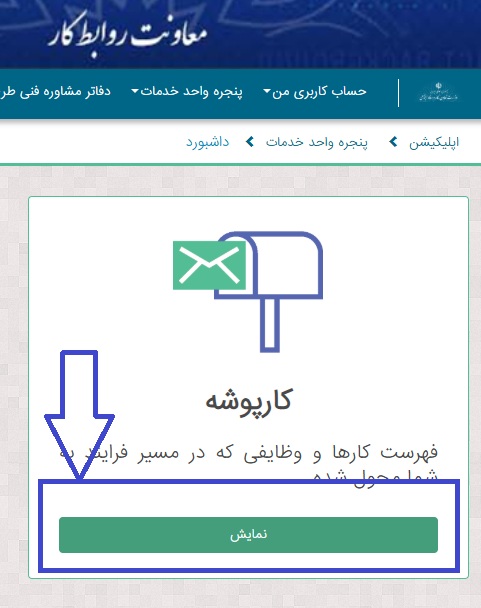 در این مرحله، از منوی «پنجره واحد خدمات» گزینه «کارپوشهها» را انتخاب کنید. این بخش محل مشاهده مکاتبات، ابلاغ زمان رسیدگی و وضعیت جریان پرونده است.