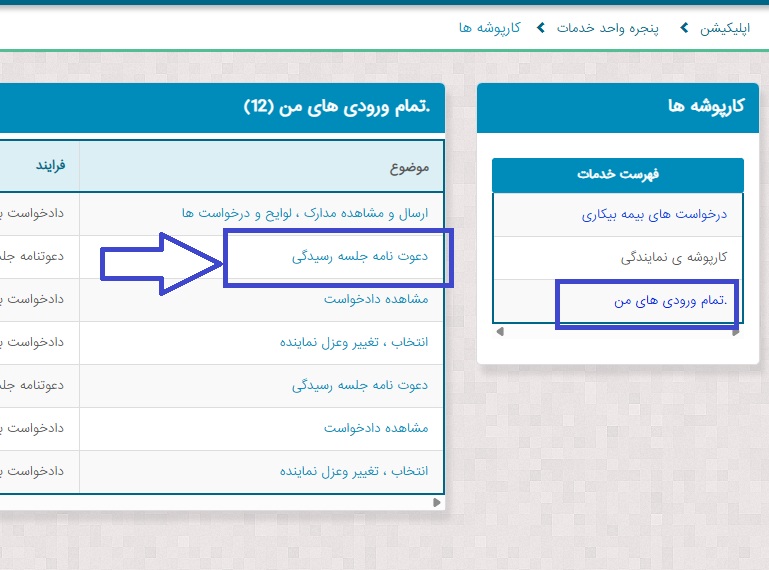 در فهرست تمام ورودیهای من، ردیف مربوط به «دعوتنامه جلسه رسیدگی» را انتخاب کنید.