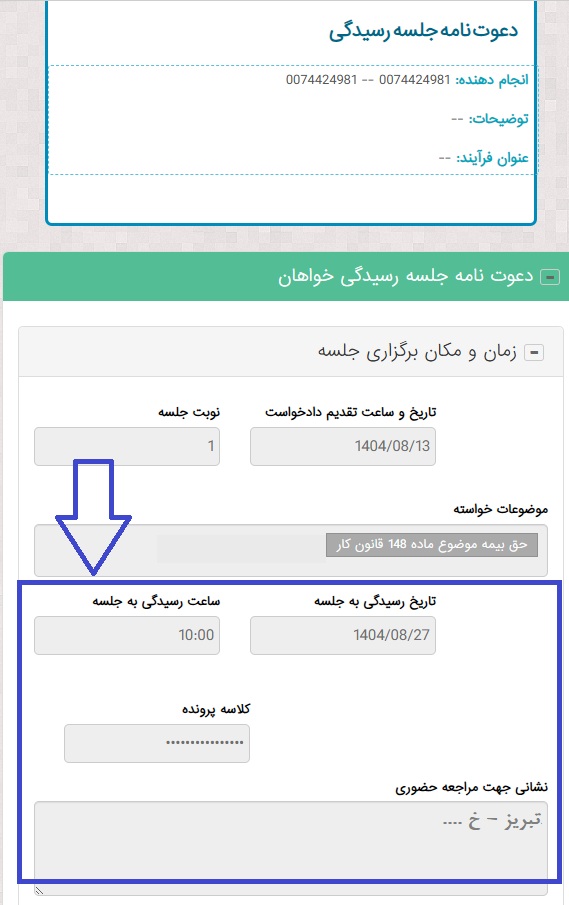 در صفحه دعوتنامه، زمان و مکان جلسه رسیدگی نمایش داده میشود. این قسمت شامل تاریخ برگزاری جلسه، ساعت رسیدگی، کلاسه پرونده و محل مراجعه حضوری است.