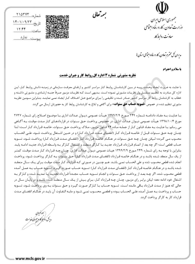 نظریه مشورتی شماره ۳ اداره کل روابط کار و جبران خدمت