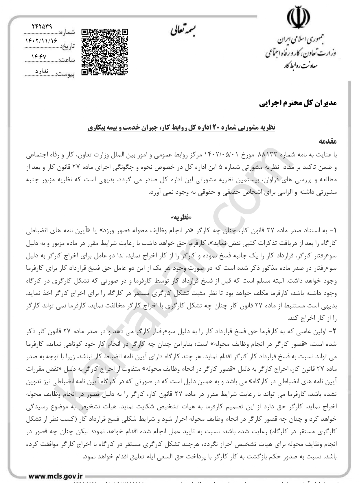 نظریه مشورتی شماره (۴) اداره کل روابط کار و جبران خدمت
