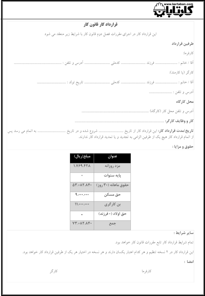 نمونه قرارداد کار ۲ فرزند ۰ سابقه