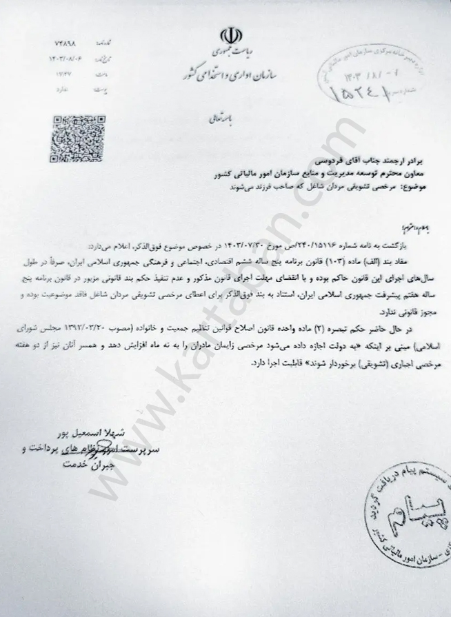 بازگشت به نامه شماره ۲۴۰/۱۵۱۱۶نص مورخ ۱۴۰۳/۰۷/۳۰ در خصوص مرخصی تشویقی پدران شاغل که صاحب فرزند میشوند، اعلام میدارد: